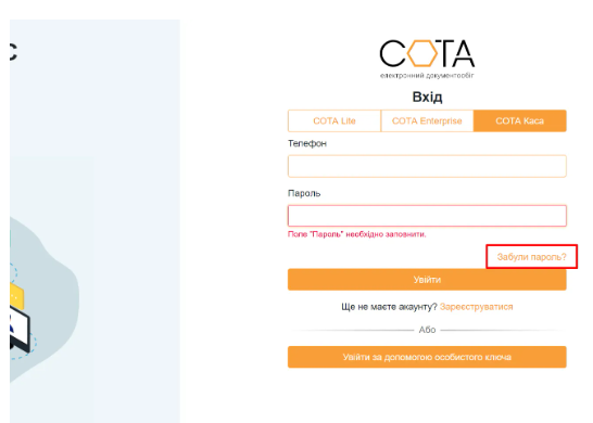Якщо ви втратили або загубили пароль для входу у веб-сервіс “СОТА”, виконайте наступні кроки для відновлення пароля: